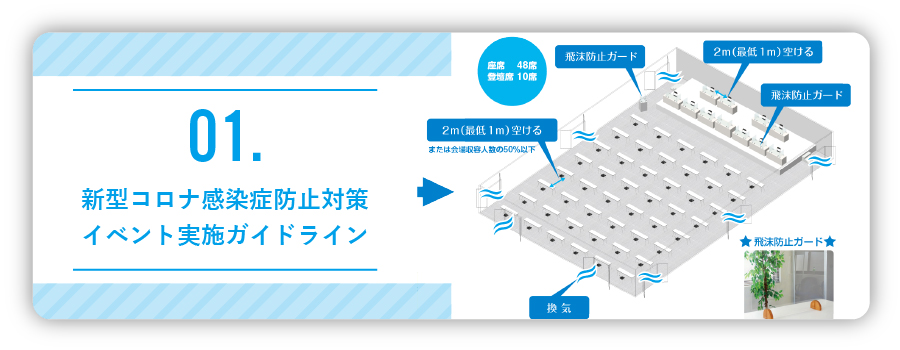 東京企画装飾㈱では新型コロナウイルス感染防止対策として、独自に「イベント実施におけるガイドライン」を策定し、「飛沫感染対策アイテム」各種の製作、販売をおこなっております。これからのwithコロナ時代に対応したイベントや製品提案をおこない、お客様の安心と安全をサポートします。
