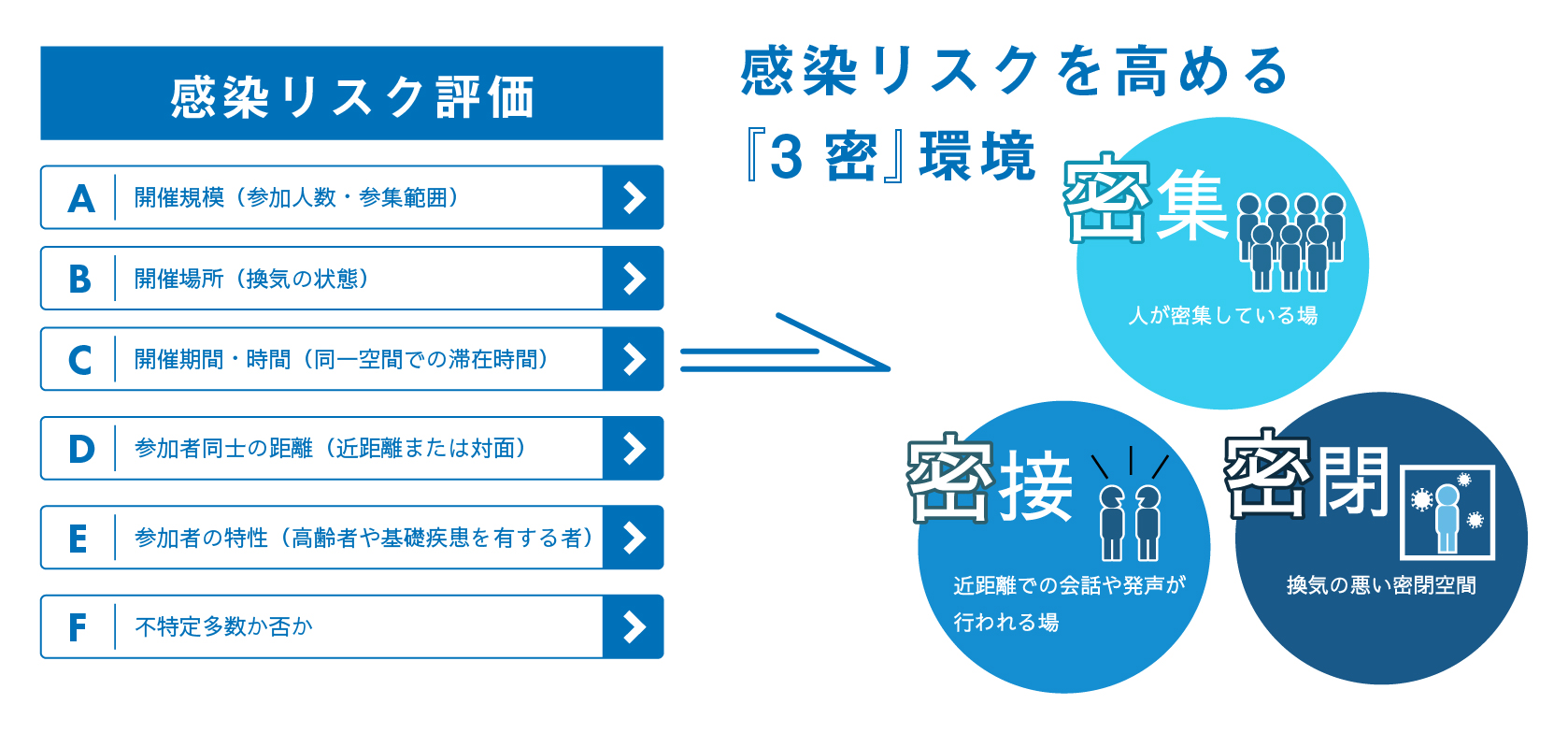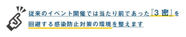弊社では、イベント現場における感染防止対策の取り組みが社会全体の感染症拡大防止につながることを認識した上で、各イベント現場の特性に応じた感染リスクの評価をおこない、それに応じた対策(3密の回避)を講じます。