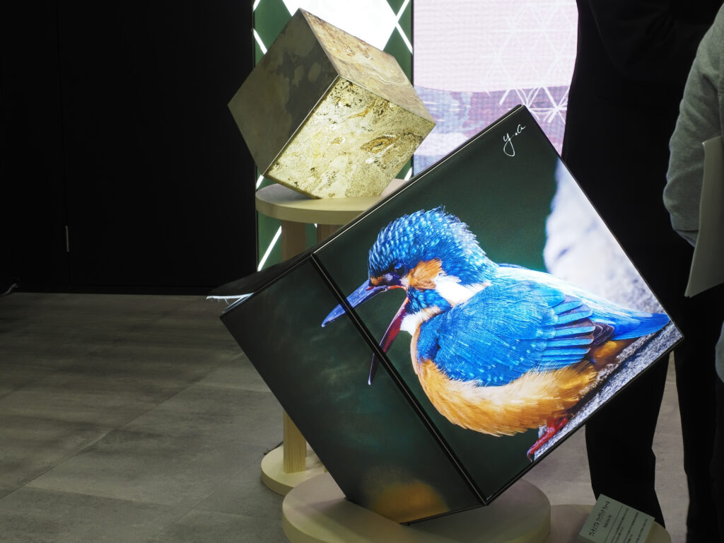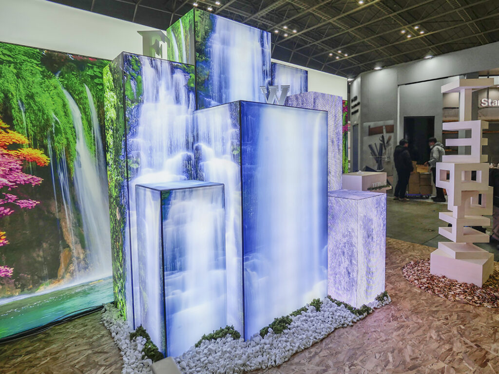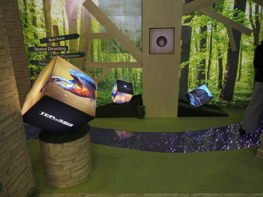 「北欧の森」 をテーマに、ファブリック印刷とマルチメディアを融合させて空間を表現しました。弊社オリジナルフレームの強みを活かした六面体の試作品を初披露しました。
