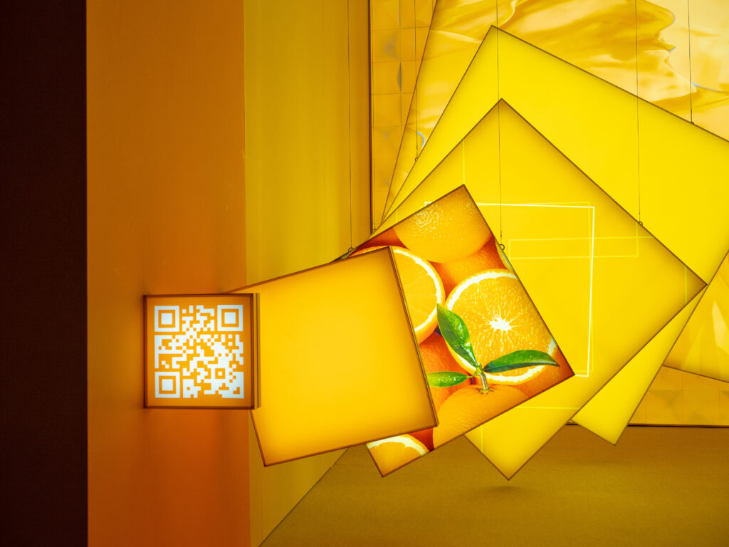 “軽やかな浮遊感とビタミンカラーの輝き”をコンセプトに1コマで出展し、新商品の薄型内照式フレックスウォール『FF40L』を初披露しました。