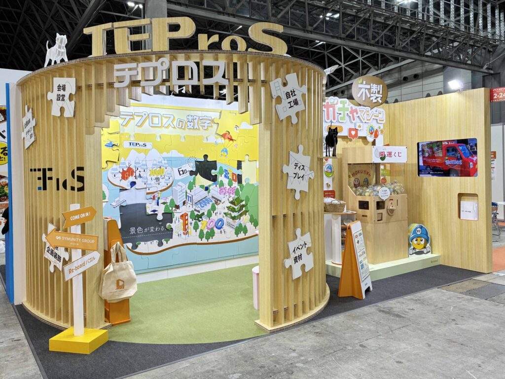 前年同様、「空間装飾の可能性」をテーマにフレックスウォールを中心に使用し、春の滝を表現しました。初披露の『MOKUガチャ』は300人以上の方に回していただきました。