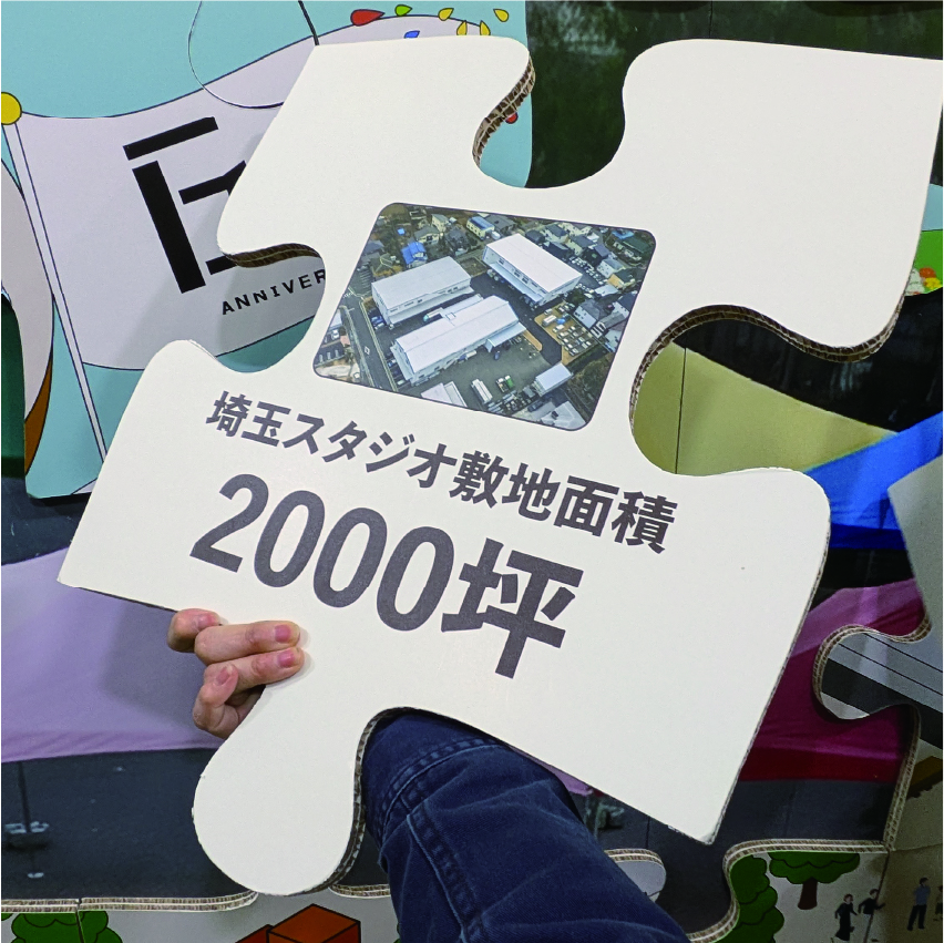 数字のピースを裏返すと説明が現れる仕掛けになっており、例えば「1 → ワンストップ対応」「80 → Re-boardの原材料は樹齢80年以上の樹木」「2000 → 埼玉スタジオ敷地面積2000坪」などが書かれています。