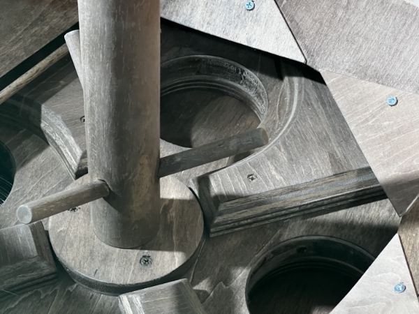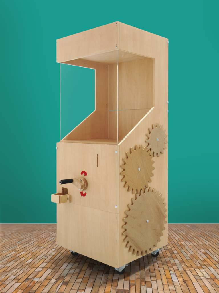 弊社が得意とする木工技術を活かした、見て遊んで楽しいマシンです。ハンドルを回すと横の歯車が連動して回ります。