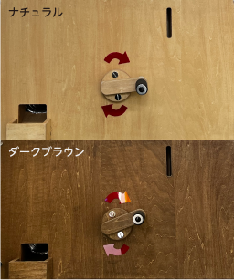横の歯車とのコントラストが可愛い「ナチュラル」と、落ち着いた風合いの「ダークブラウン」をご用意しています。