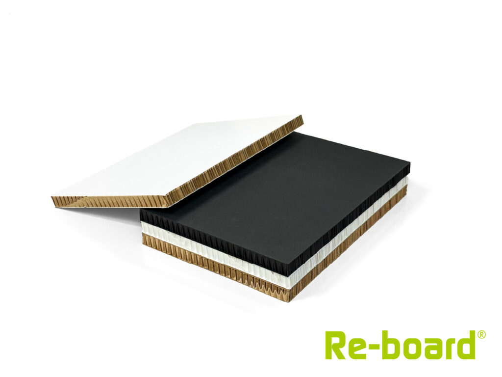 Re-board®︎はヨーロッパで誕生した、環境にやさしい板素材です。印刷可能な100%紙製ながら非常に高い耐湿・耐久性を持ち、展示会やイベントの壁面・什器への需要が高まっています。オリジナル設計にも対応していますのでご相談ください。