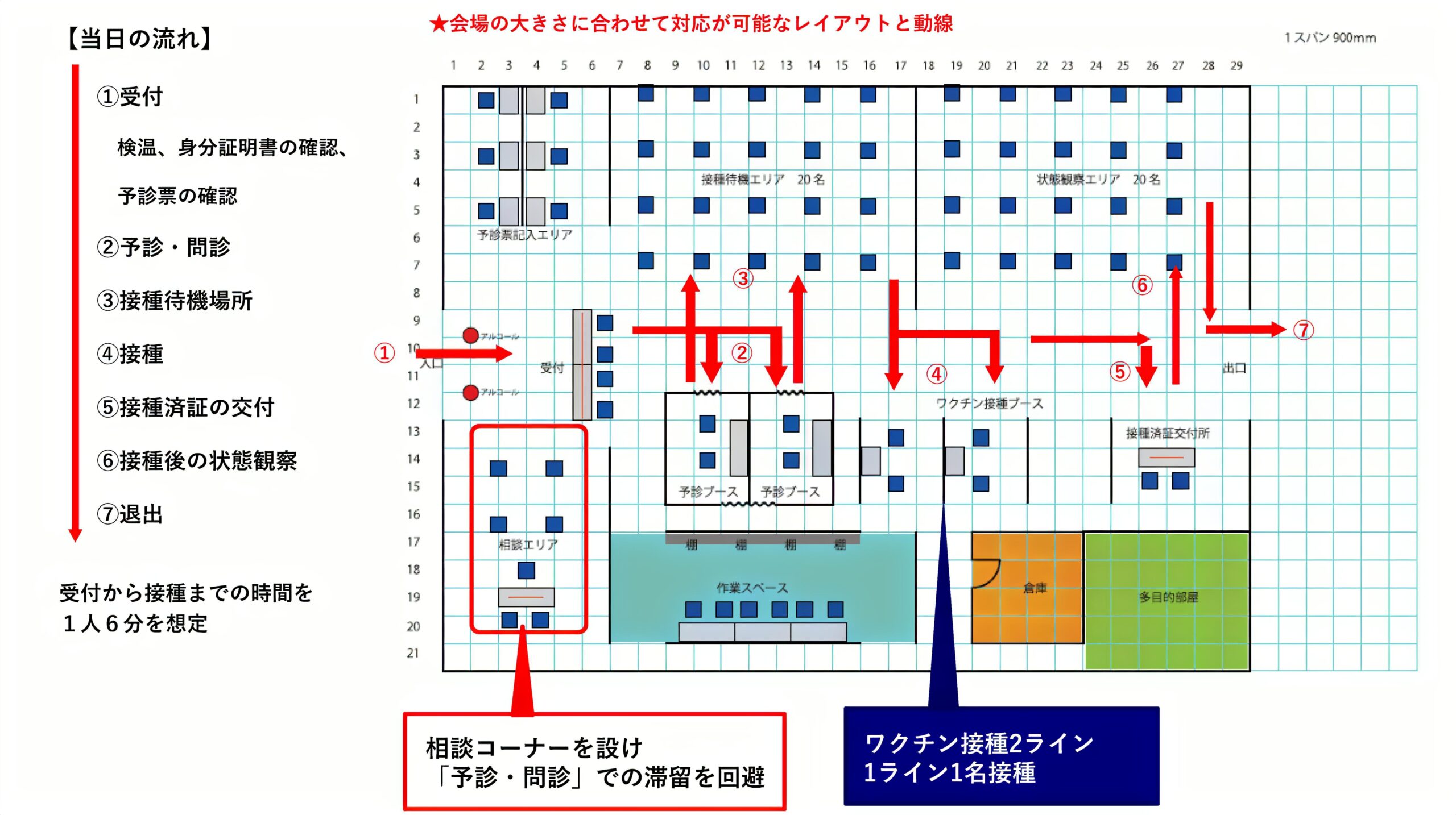 現在、日本国内において新型コロナウイルスワクチン接種に向けての準備が進む中、各地では接種会場の設営に向け、様々な検討がなされております。 弊社では、厚生労働省が発出した「新型コロナウイルスワクチンの接種体制確保について自治体説明会2」(令和3年1月25日付、P12)資料に基づき、円滑に会場設営をするための資料を作成。 当日のフロー、会場の大きさによって対応ができる会場レイアウト、備品を記載した資料となります。 詳細については、実際の会場や運営方法、必要備品をお聞きしながら、早急な対応にも寄り添って円滑に会場設営を進めていきたいと考えております。 そのためのご参考資料としてまずはご一読頂ければ幸いです。 ※職域接種のワクチン接種会場のご相談も承ります。