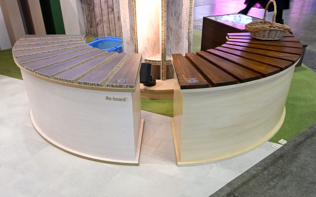 新しく提供できるようになった素材「Re-board®を中心に、弊社が得意としている木工造作、ファブリックなどを組み合わせたブースです。