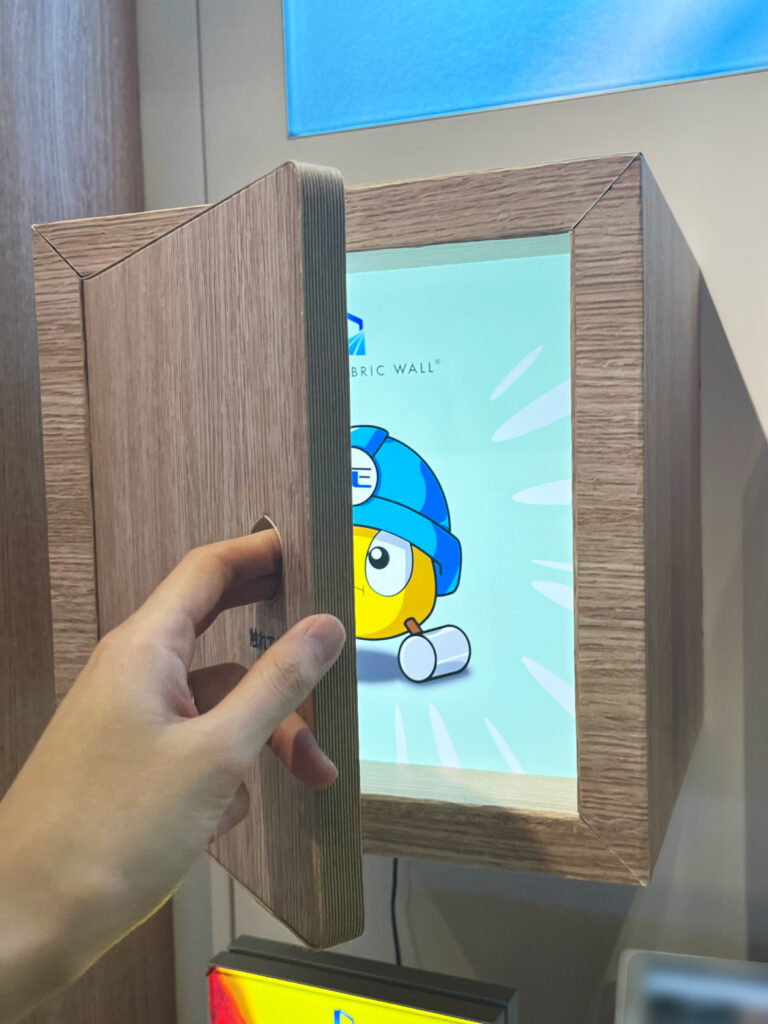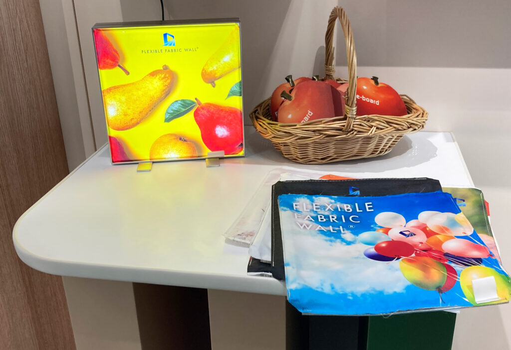 弊社オリジナルファブリックフレーム「フレキシブルファブリックウォール®(FFW)」の施工のしやすさ・内照の美しさを活かし、幅広い制作が可能なRe-board®と組み合わせました。