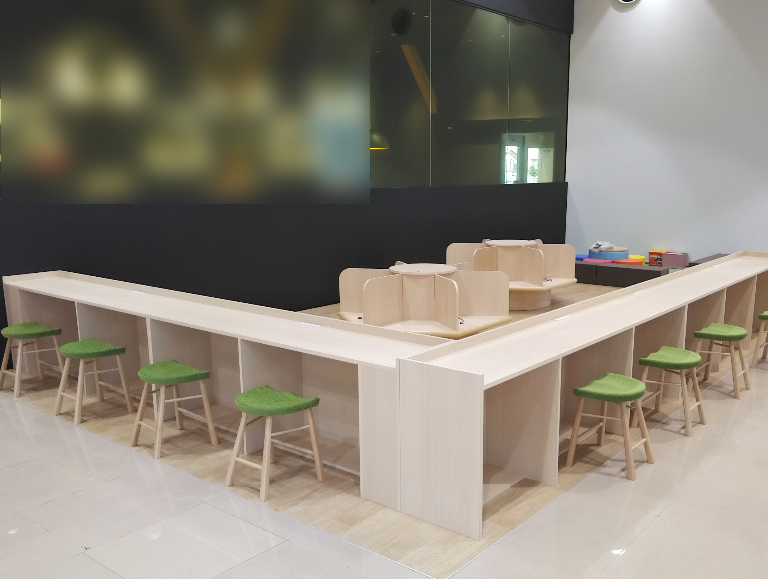 L字カウンターと、お子様がタブレットで遊べる六角形のテーブルを木工で製作・施工いたしました。